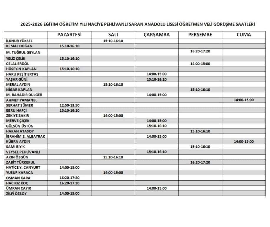 2025-2026 EĞİTİM ÖĞRETİM YILI VELİ GÖRÜŞME SAATLERİ